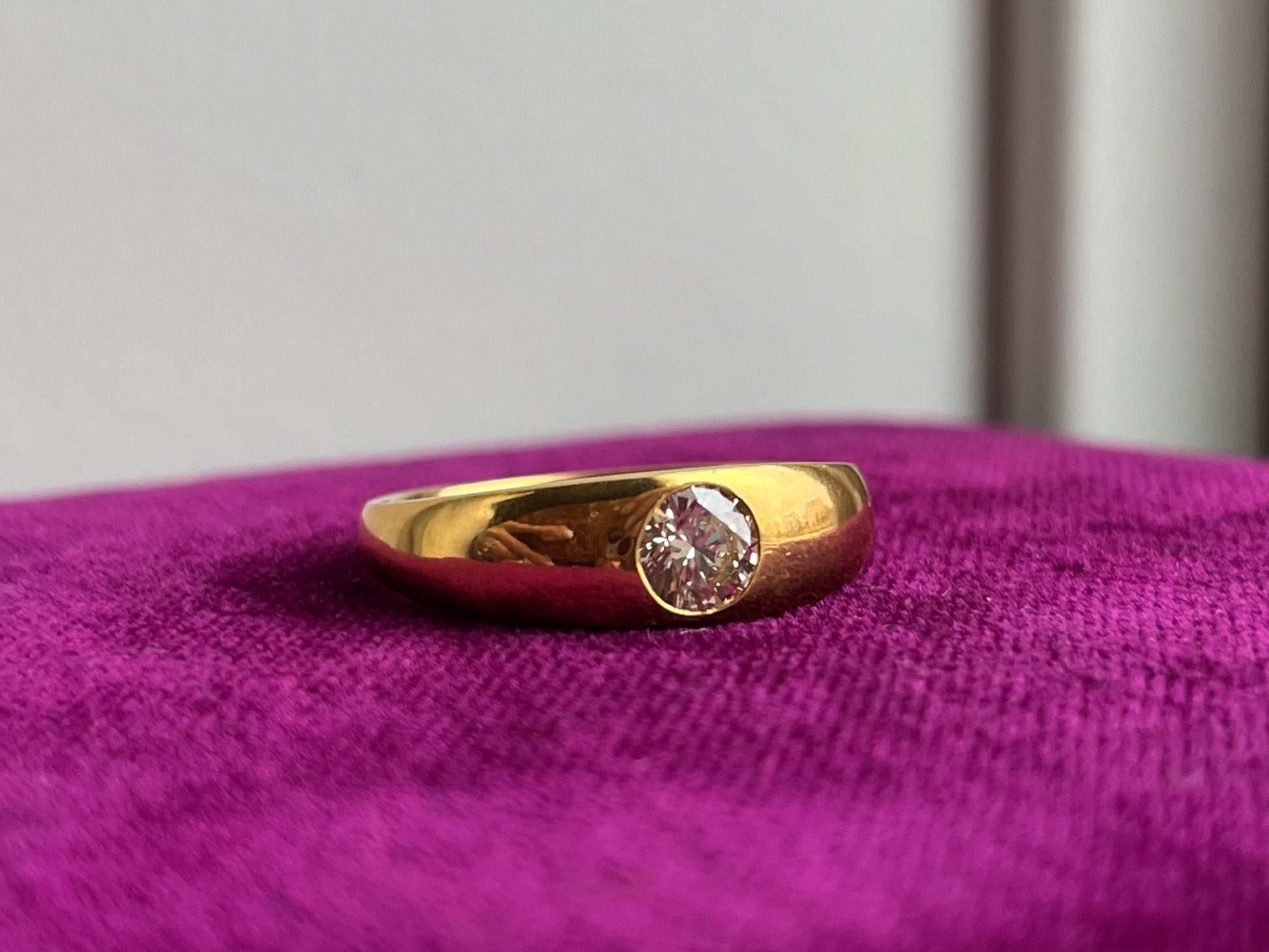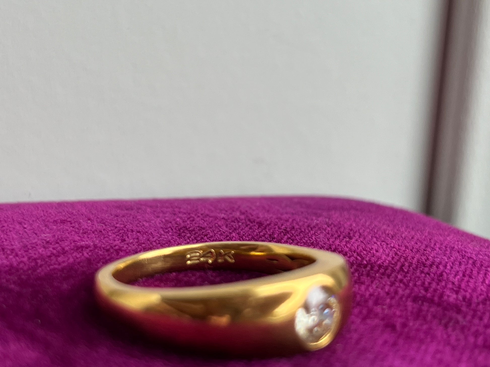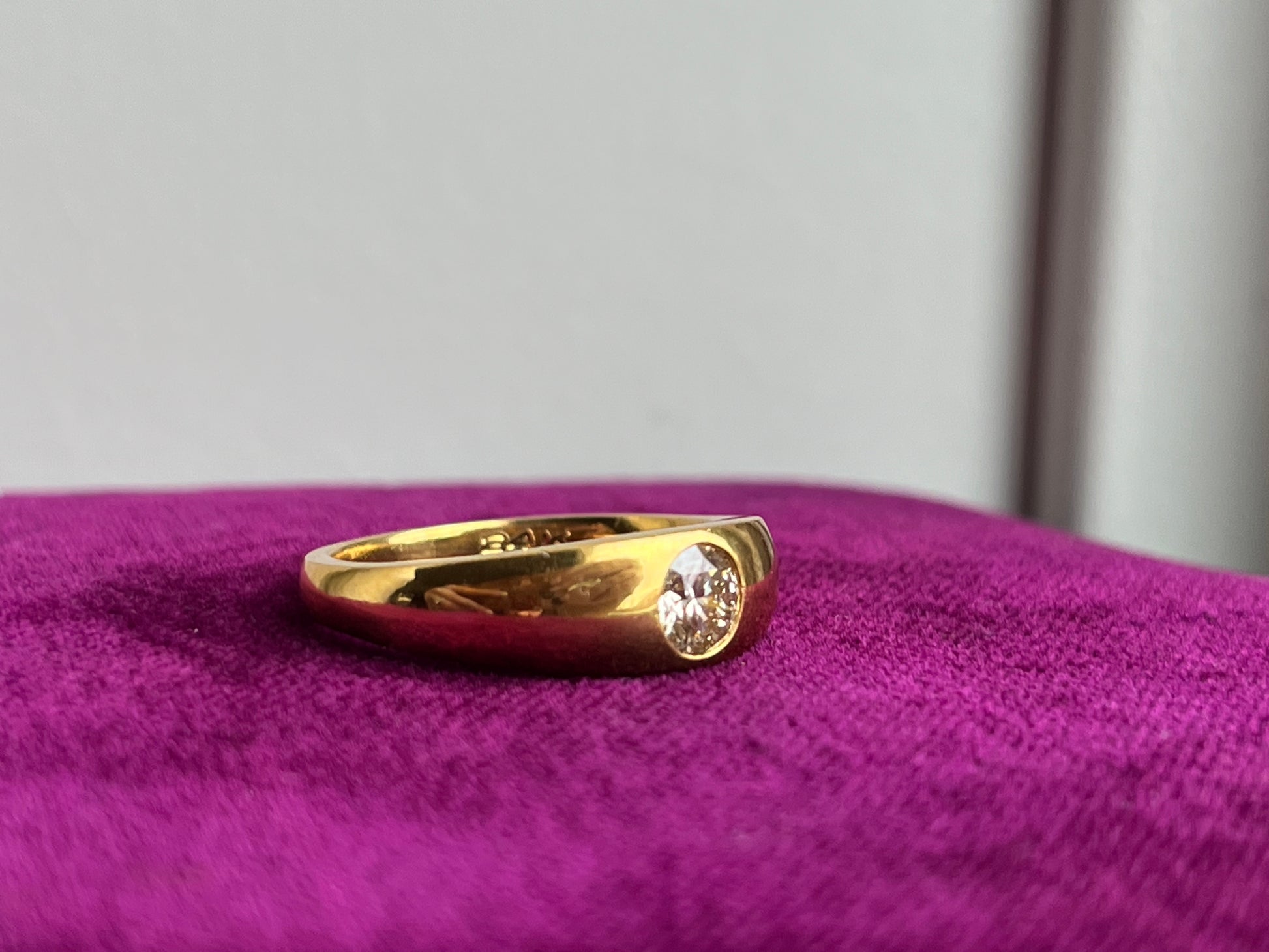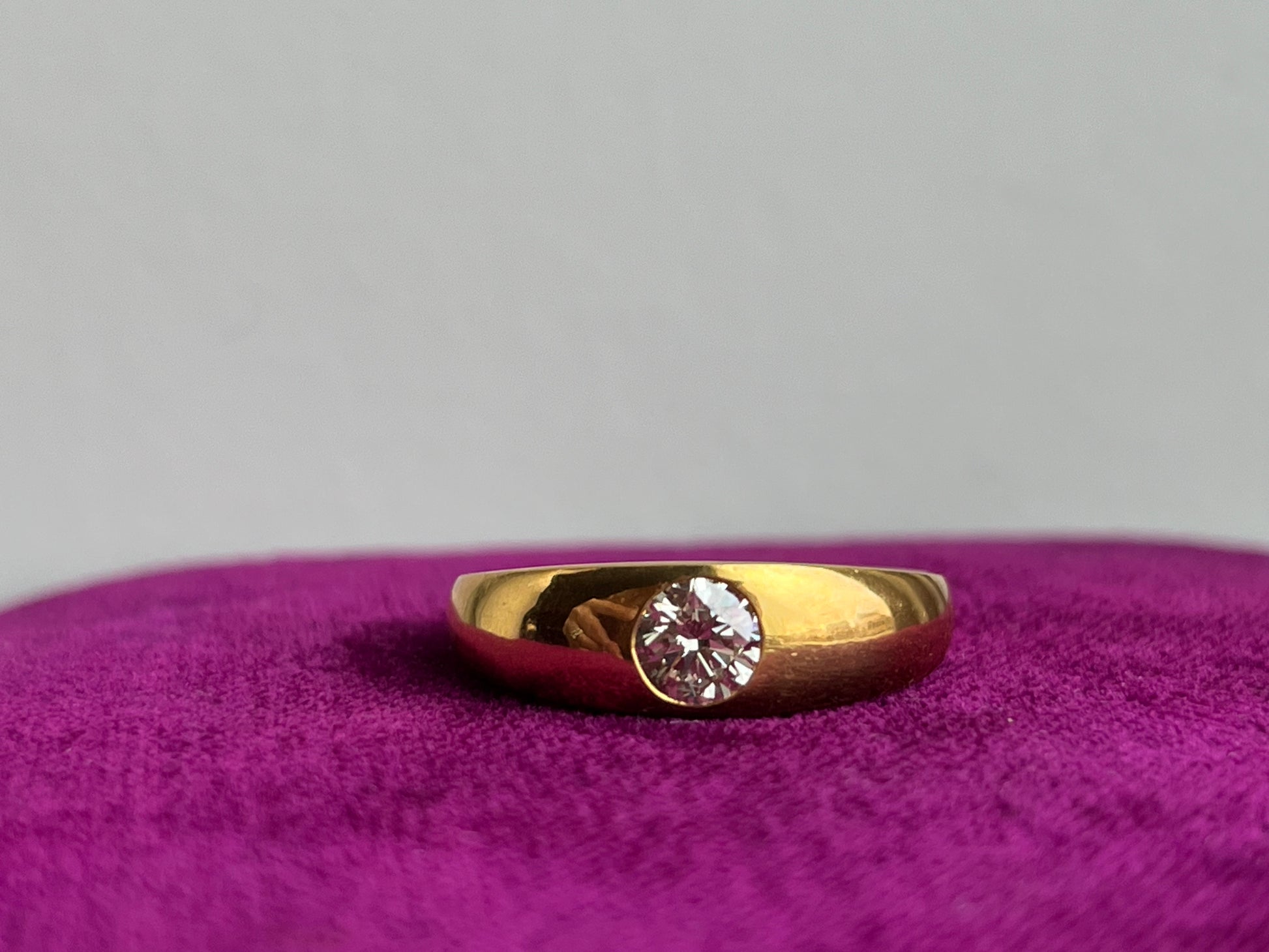 Crafted from luxurious 24K yellow gold, this ring exudes warmth and radiance, elevating any ensemble with its rich hue and lustrous finish. The gypsy-style setting adds a touch of artisanal charm, allowing the diamond to sit flush against the gold band for a seamless and organic look.