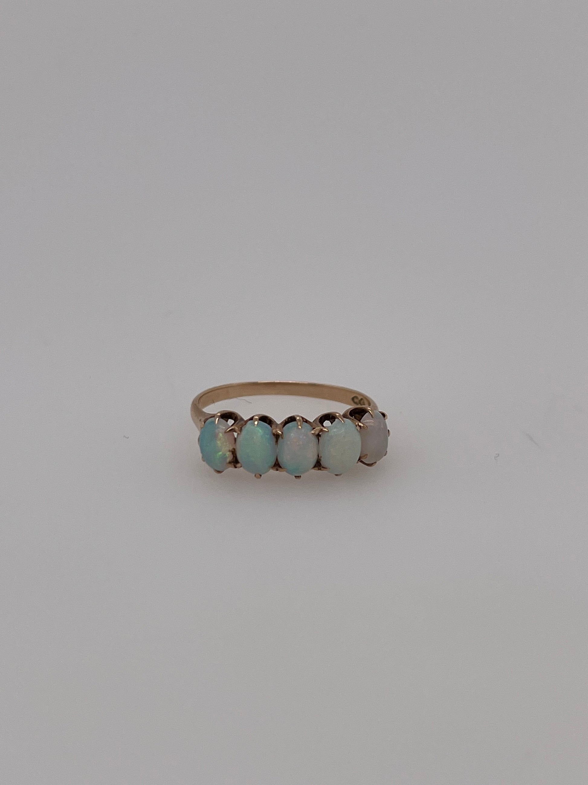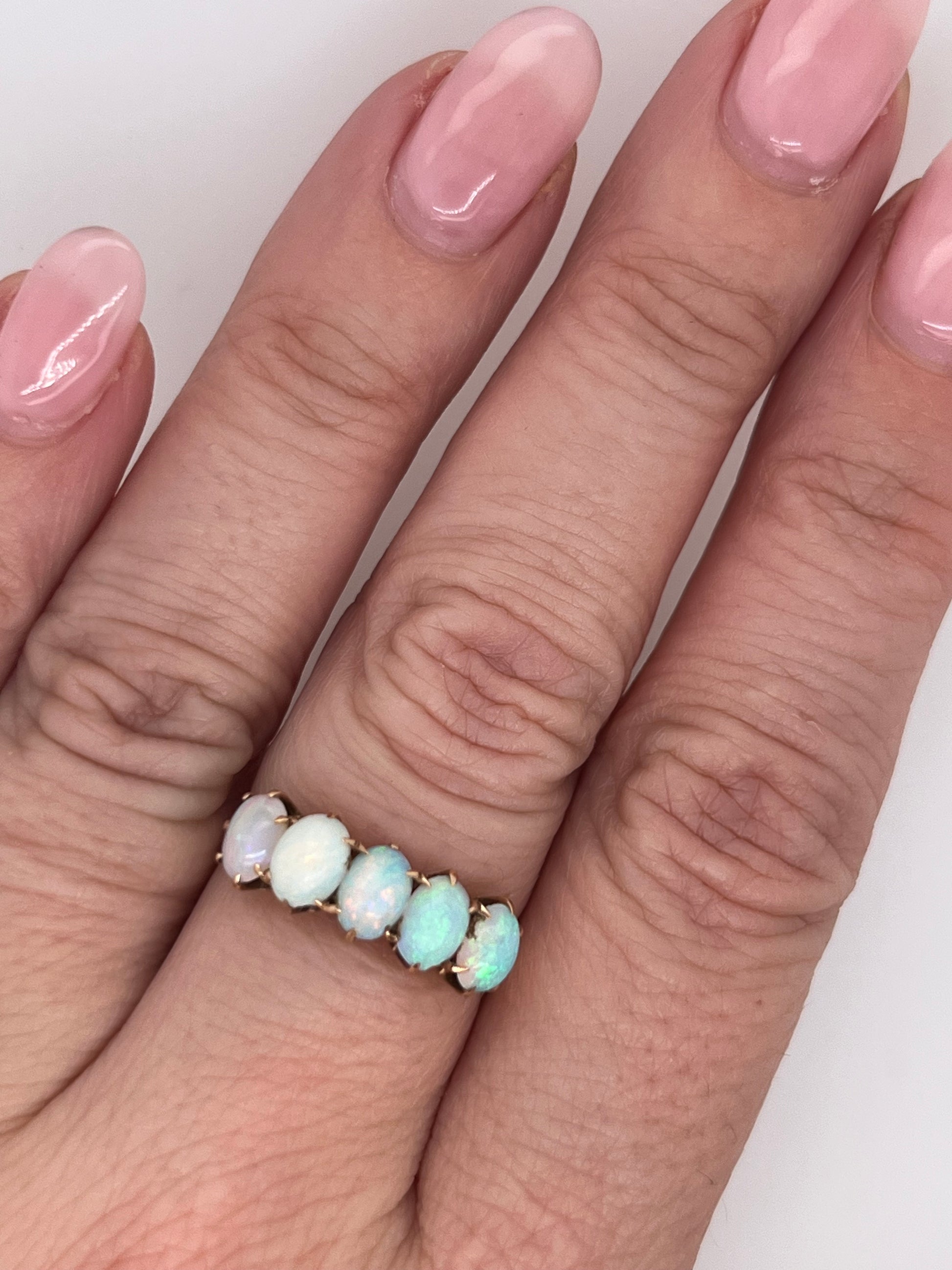 Get ready to be swept away by this stunning 14k ring featuring five vibrant opals! These oval-shaped, cabochon-cut opals are an impressive 2.5 carat in total weight and each one has its own unique speckles of colors, creating a beautiful rainbow effect. Despite its age, this ring is in excellent condition and sits low to the finger. You'll not only look fabulous wearing it, but you'll also feel balanced and harmonious thanks to the powerful properties of opal. It's known for healing old patterns and amplifying positive energies, making it a must-have stone in your collection. So why wait? Get your hands on this gem and let your light shine!