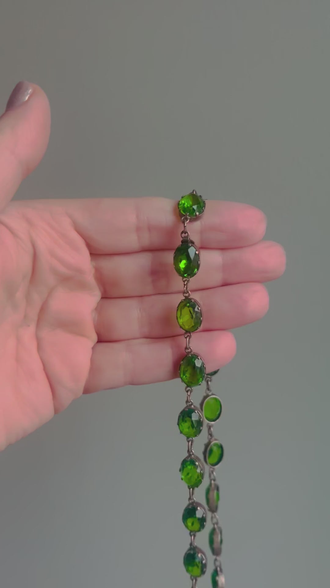 This antique Victorian era necklace (circa 1850) features vivid green paste stones mounted in sterling silver. The chain has a hidden box clasp.