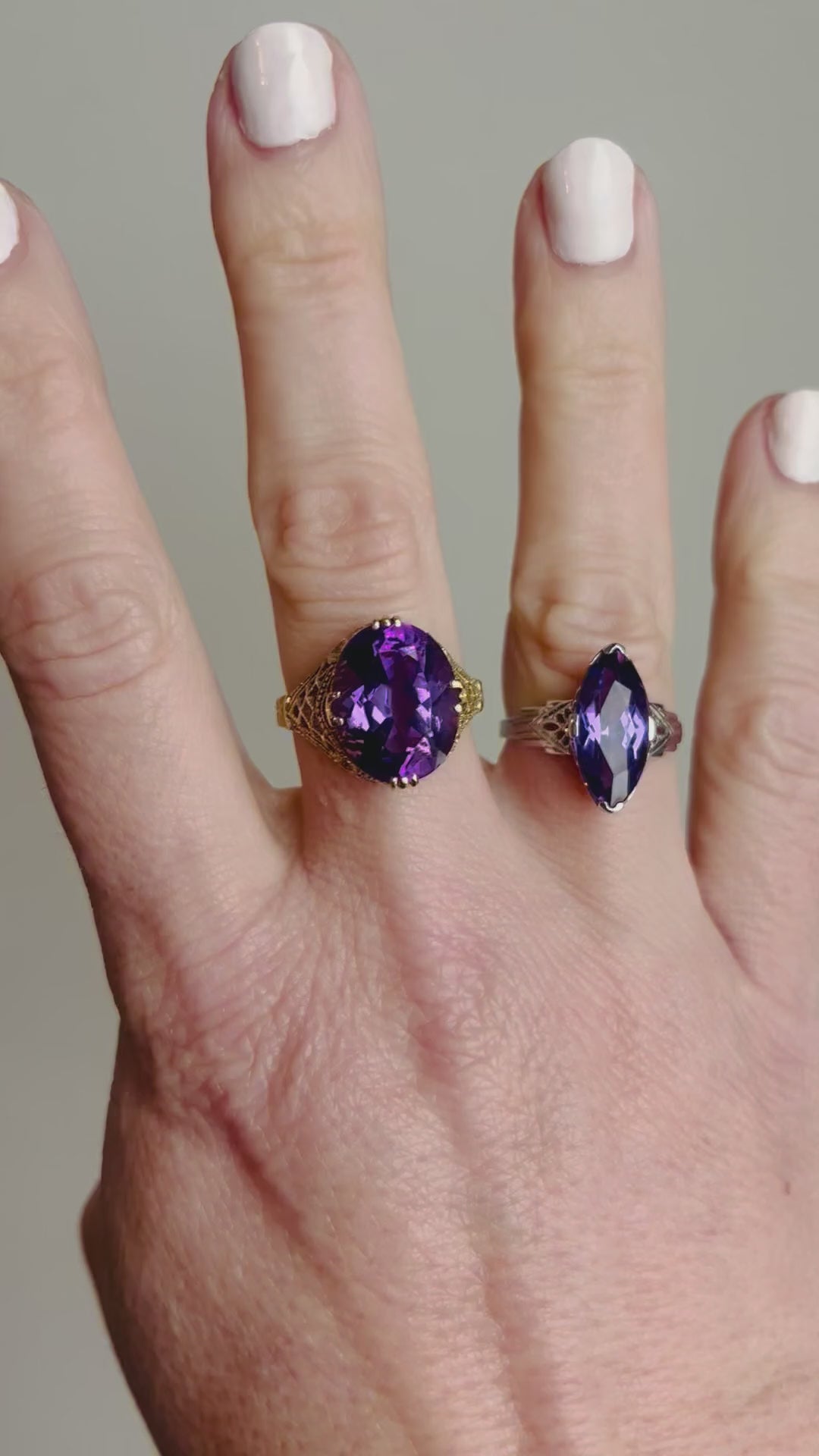 Art Deco jewelry often features symmetrical and angular designs, with an emphasis on symmetry and symmetry. And this beauty does just that. The ring is made of 14-karat yellow gold. Yellow gold rare for the time period in Art Deco jewelry however it complements the geometric and bold design elements on this exquisite ring. The centerpiece of the ring is a oval-cut amethyst. This Amethyst is a deep violet variety of quartz, and its rich color adds a touch of elegance to the ring. It serves as the birthstone of March.