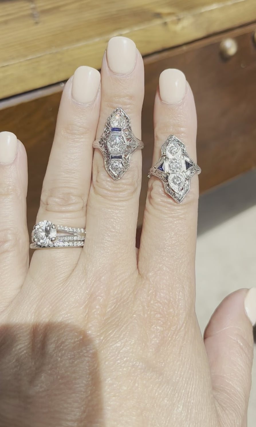 This Art Deco dinner ring is here to make a serious statement! With its three dazzling diamonds and two sparkly sapphires, it's sure to turn some heads and turn them fast. Slip it on your finger and watch your loved ones jealous eyes turn into nothing but awe and admiration. What grandeur from a piece from 100 years ago! Let your sparkle shine, darling.