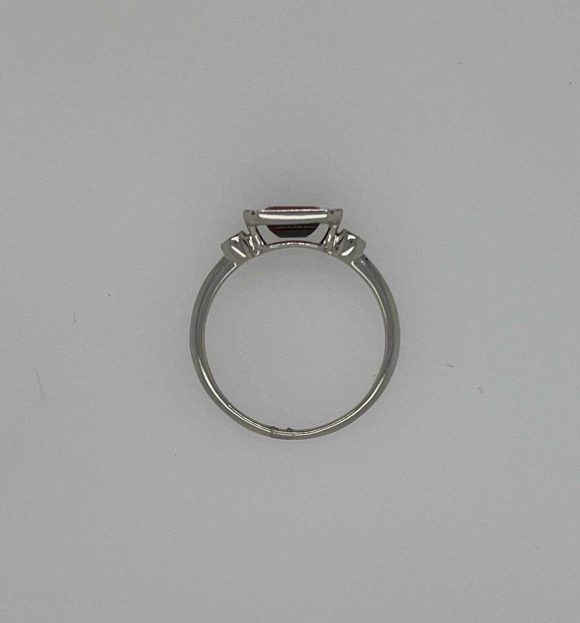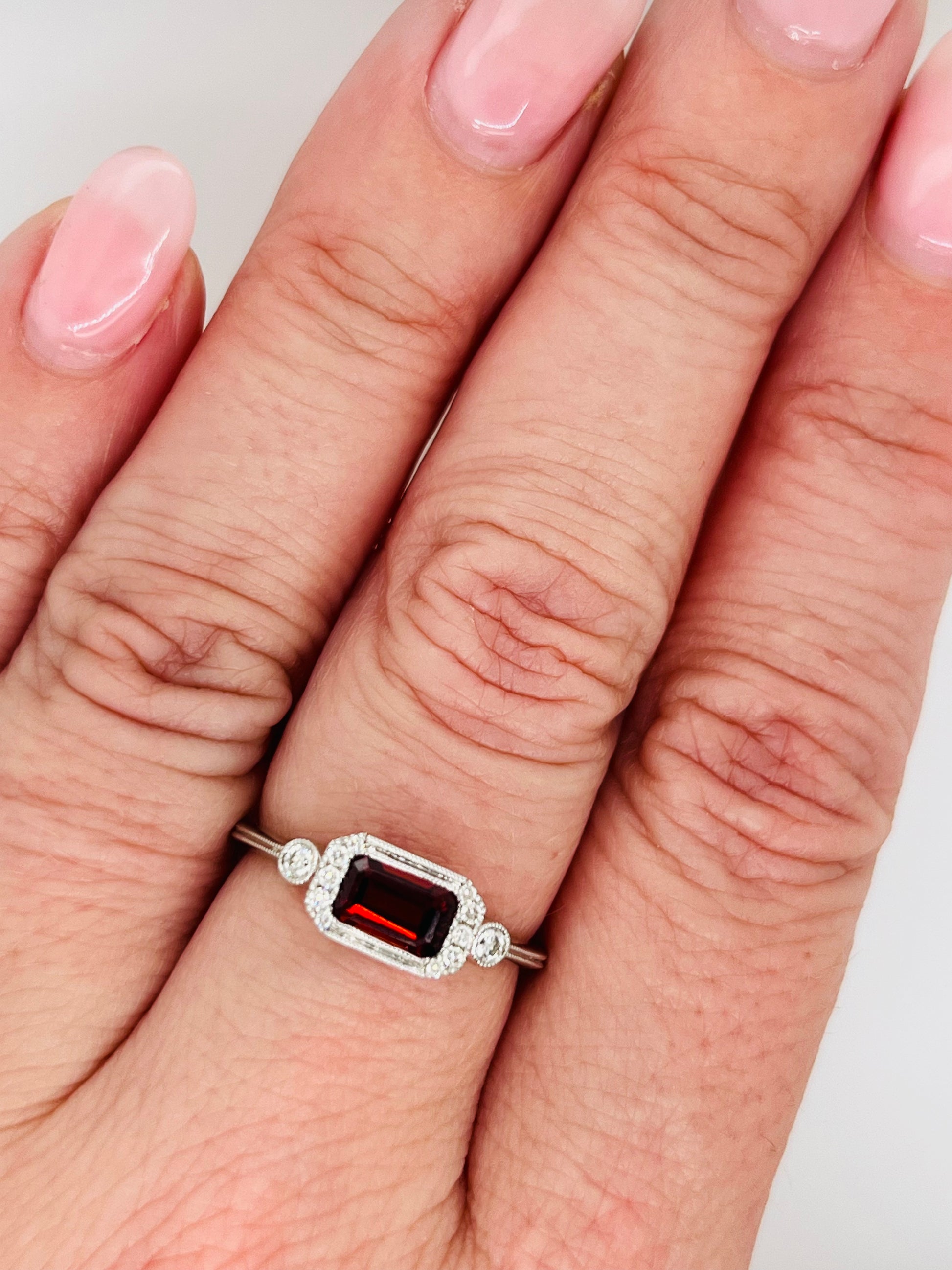 Stunning 10k white gold and garnet ring. A timeless and shiny 10 karat white gold band with a striking emerald cut bezel-set crimson garnet at its core, adding a touch of spark to this chic and refined ring showcasing the birthstone for the month of January. The rich red stone is encircled by shimmering diamonds 1/10 carat (ctw), lending a touch of glitz to the sides.