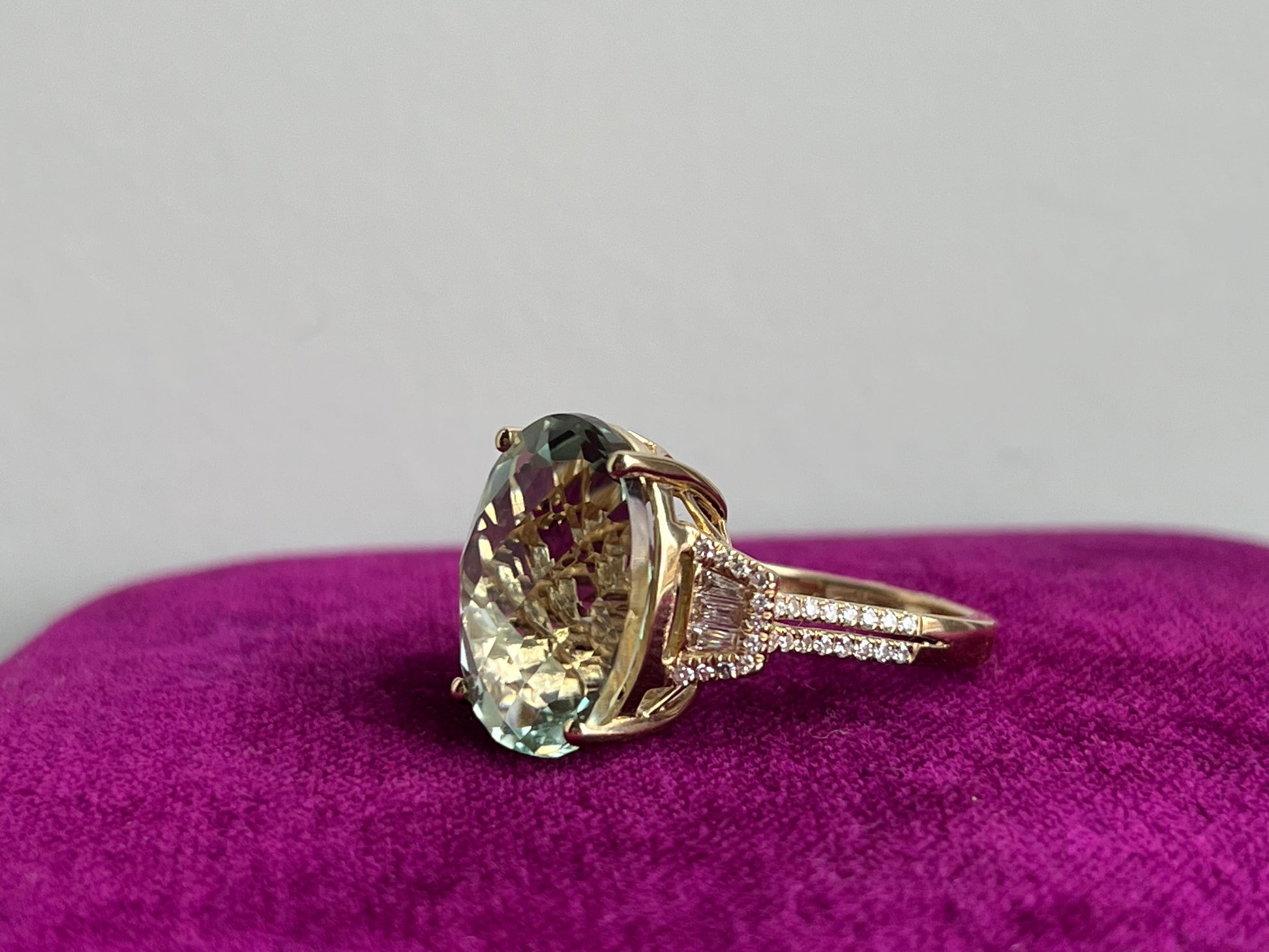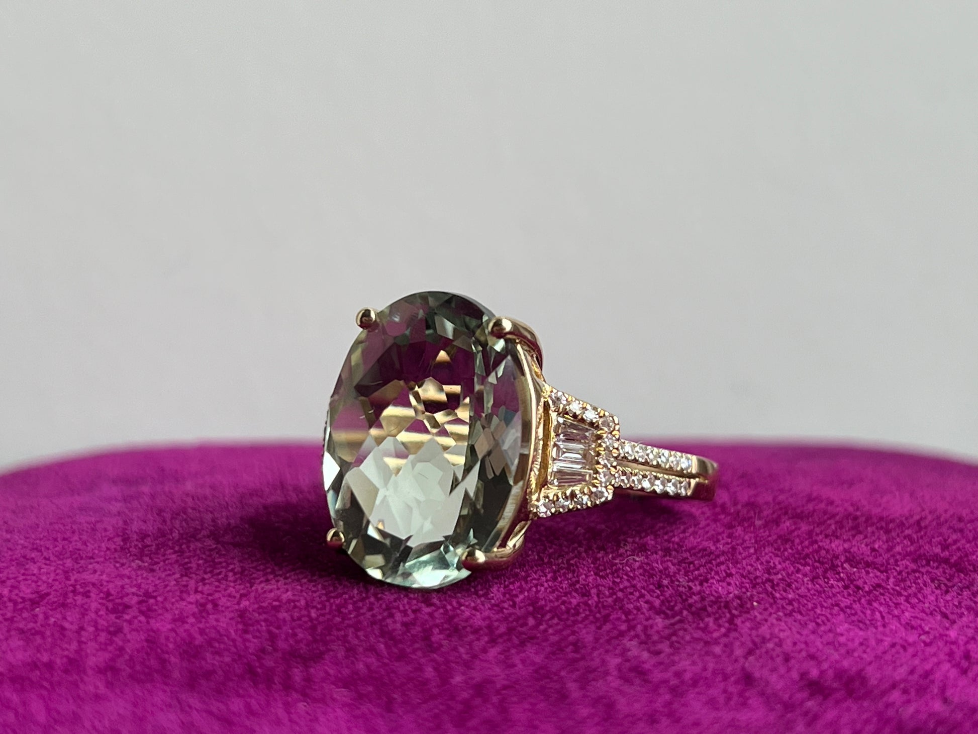 Whether worn as a symbol of love and devotion or as a statement accessory, our Green Amethyst and Diamond Ring is sure to turn heads and spark admiration wherever you go. Indulge in luxury and elegance with this exquisite piece, designed to make you feel truly special.