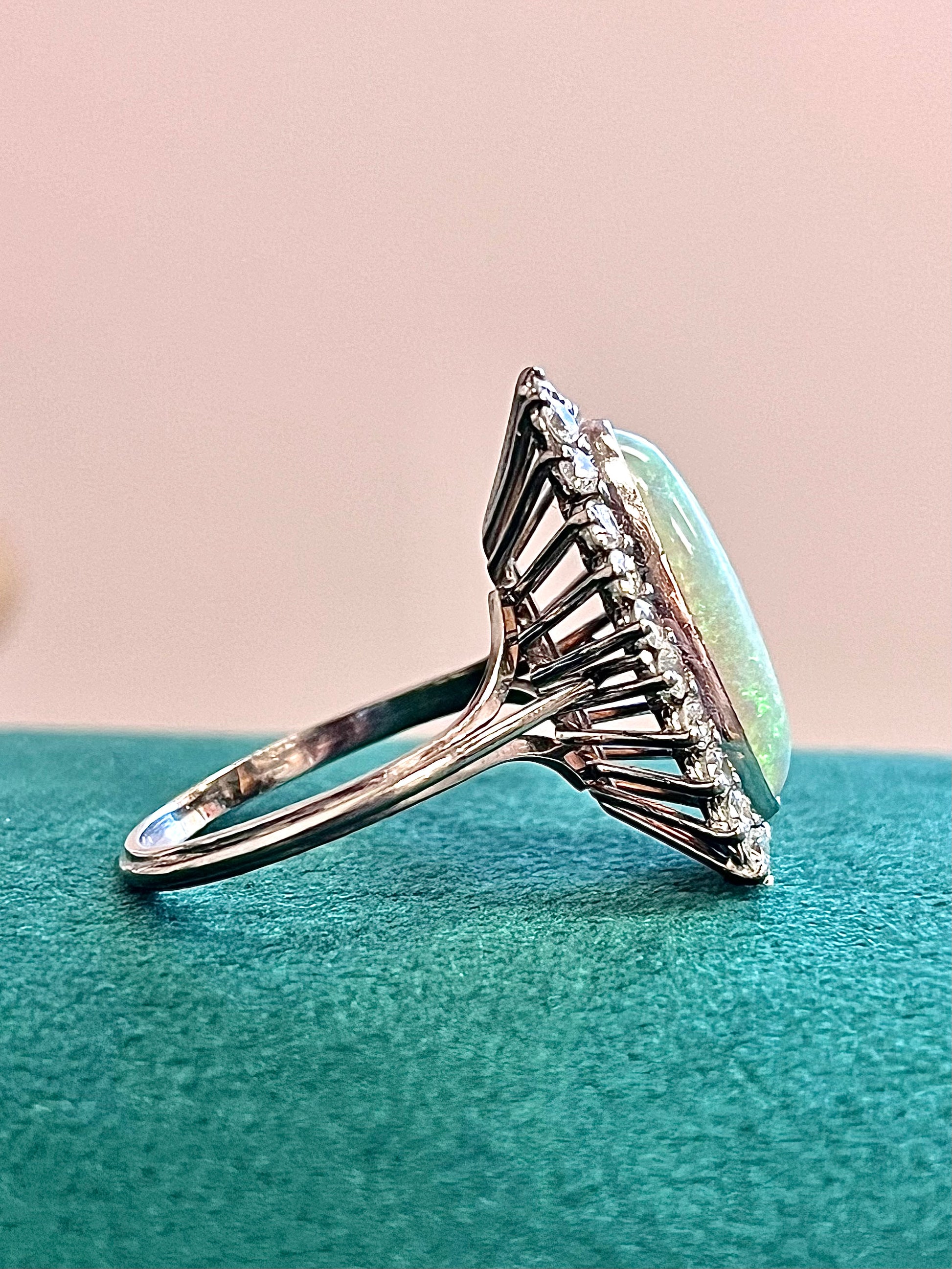 This vintage platinum ring showcases a mesmerizing opal, its iridescent hues beautifully complemented by sparkling diamond accents. Set in an elegant, timeless design, this piece exudes classic sophistication and charm.
