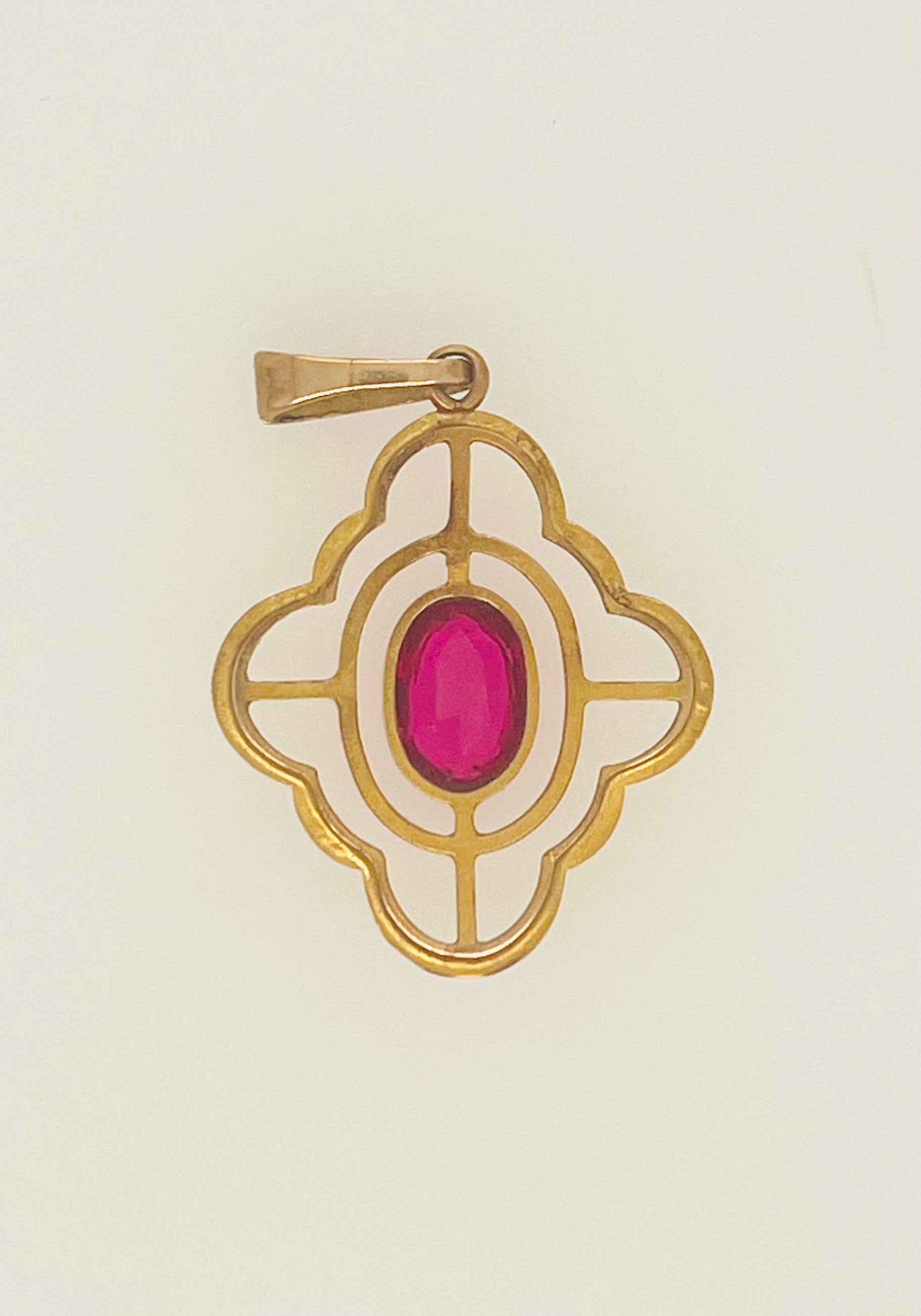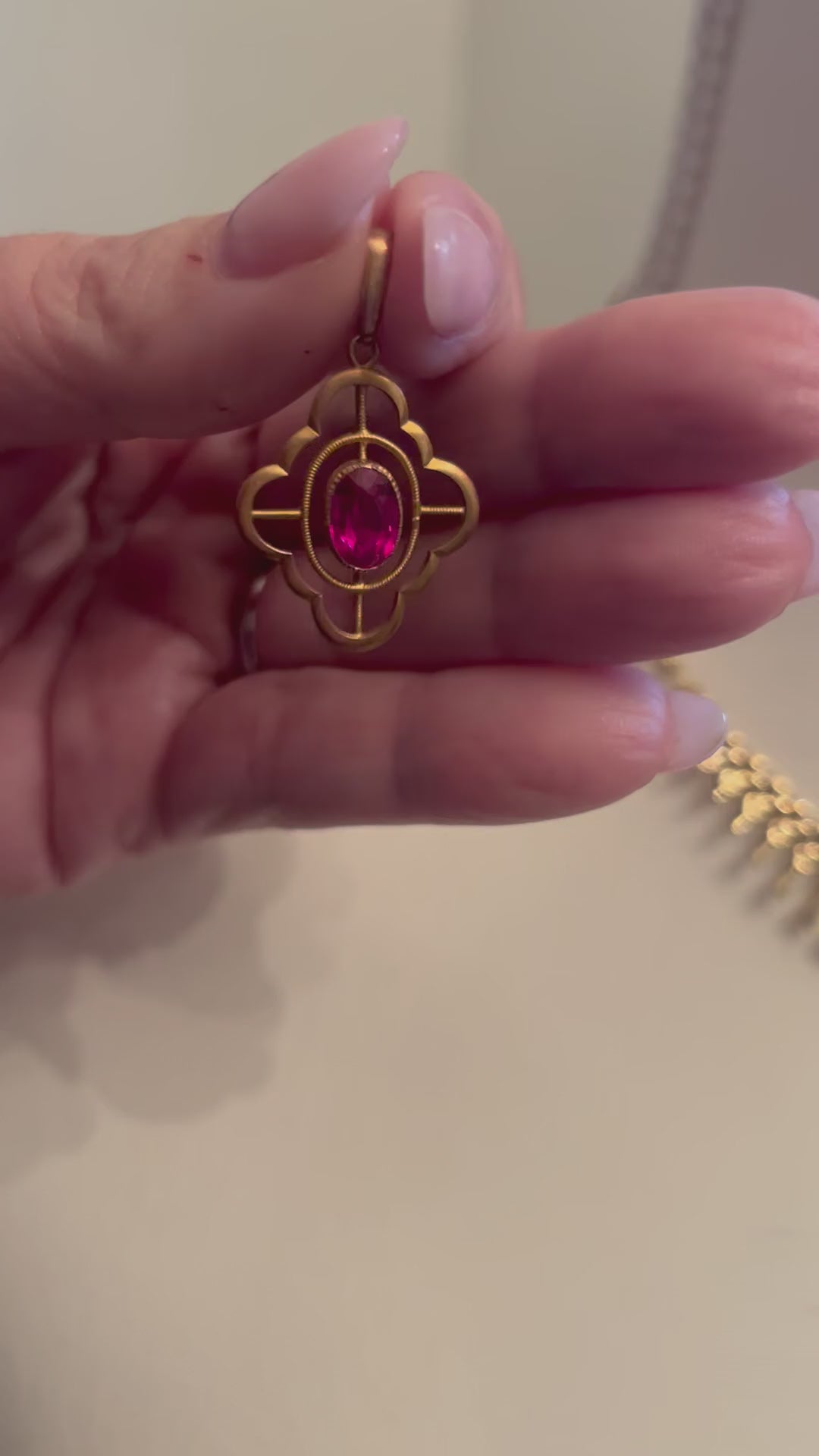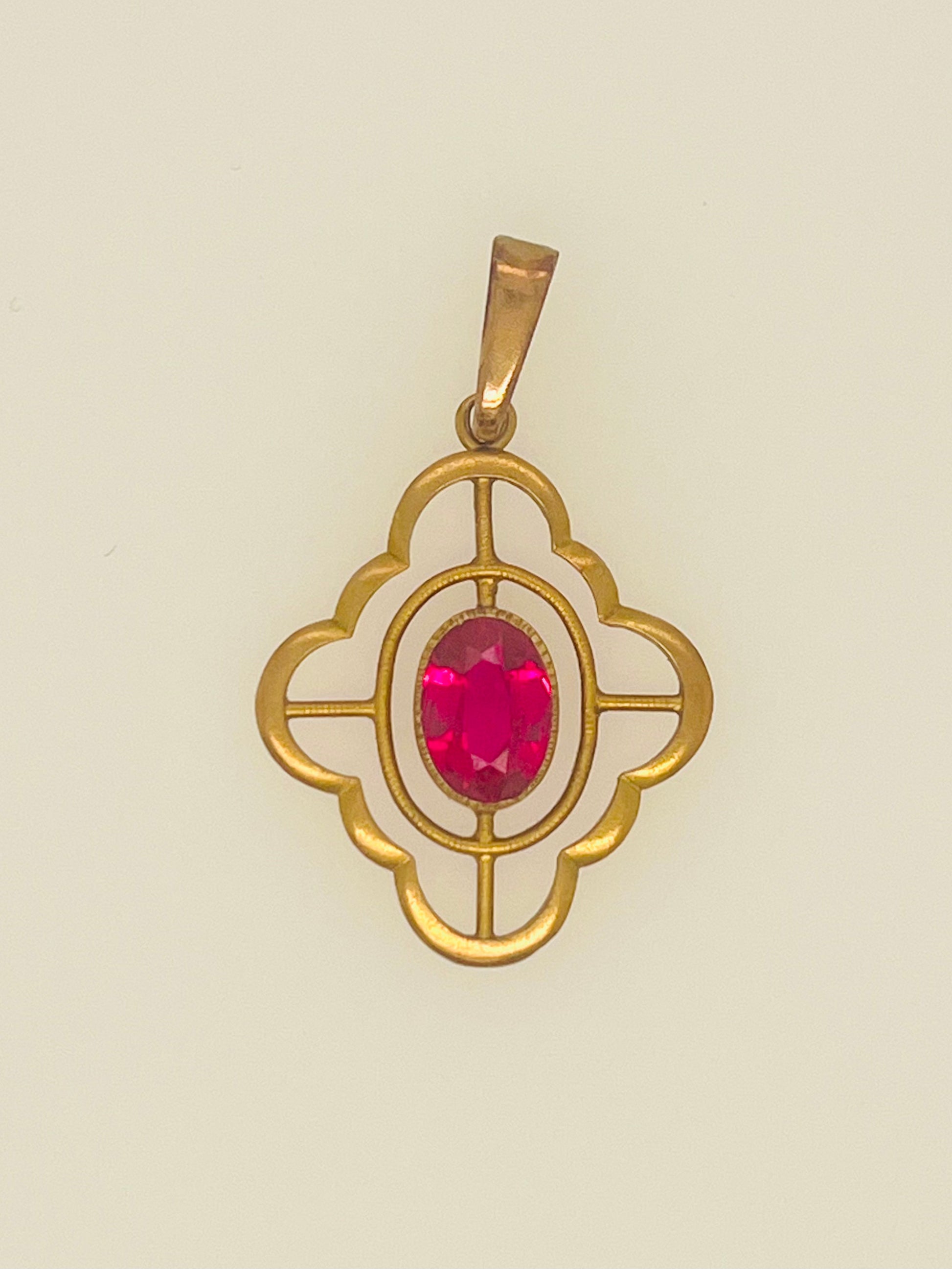 Antique 14kt Yellow Gold Synthetic Ruby. Buttery gold goodness that very shiney. Chain not included. "It's the perfect fusion of elegance and whimsy! A pop of color that will dazzle and delight everyone you meet!"
