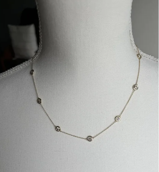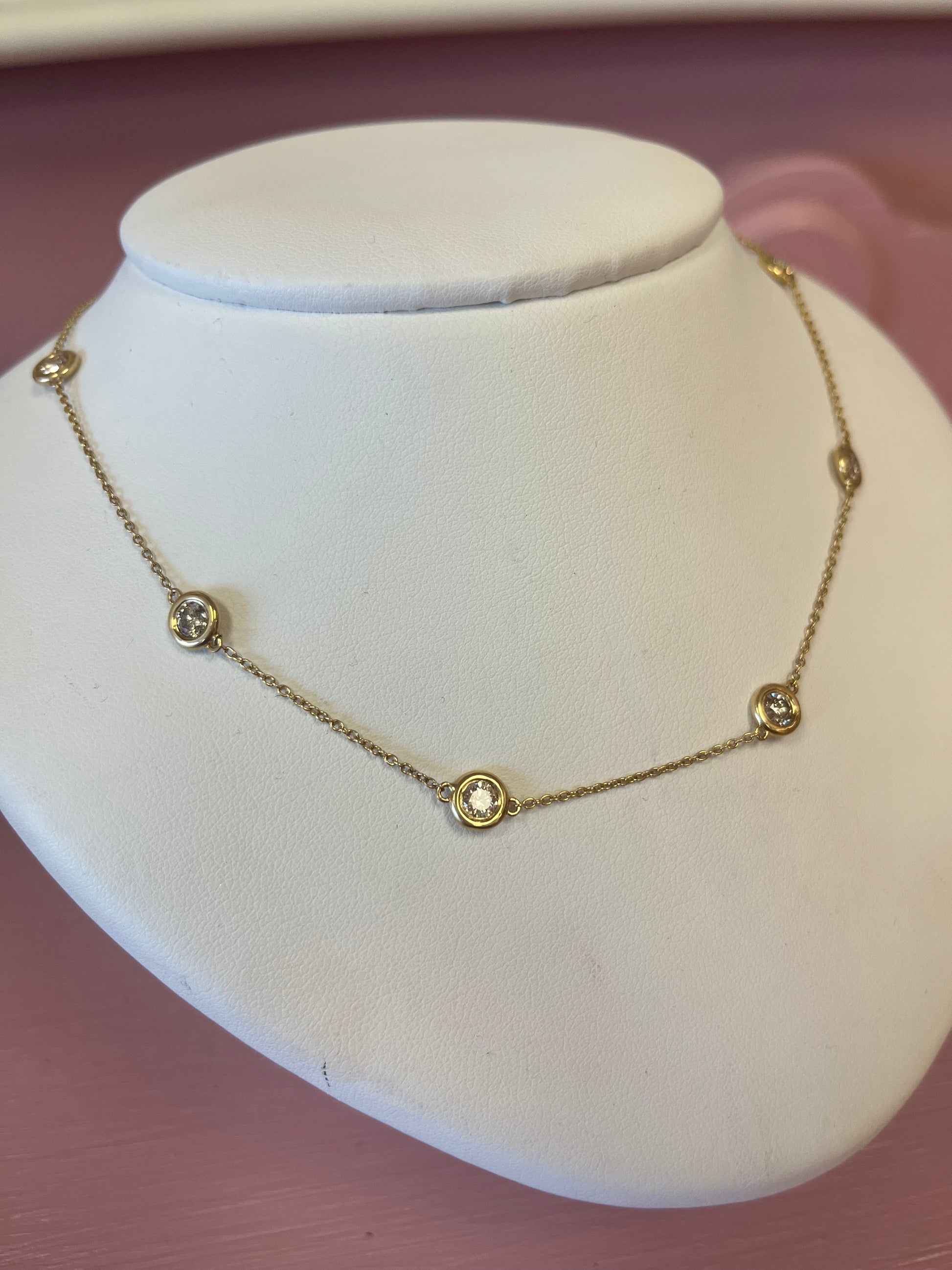 Introducing a stunning Diamonds by the Yard 14k yellow gold necklace featuring 2.20 Ctw of natural diamonds. This piece is perfect for those who appreciate the beauty of nature, with a nature-inspired theme and station style. The main stone, a diamond, is set in a yellow gold base metal with a color of white for a timeless and elegant look. The necklace is perfect for any occasion, whether it's a formal event or a casual gathering with friends. Experience the ultimate in luxury and sophistication with this beautiful piece of fine jewelry. Truly an iconic necklace.