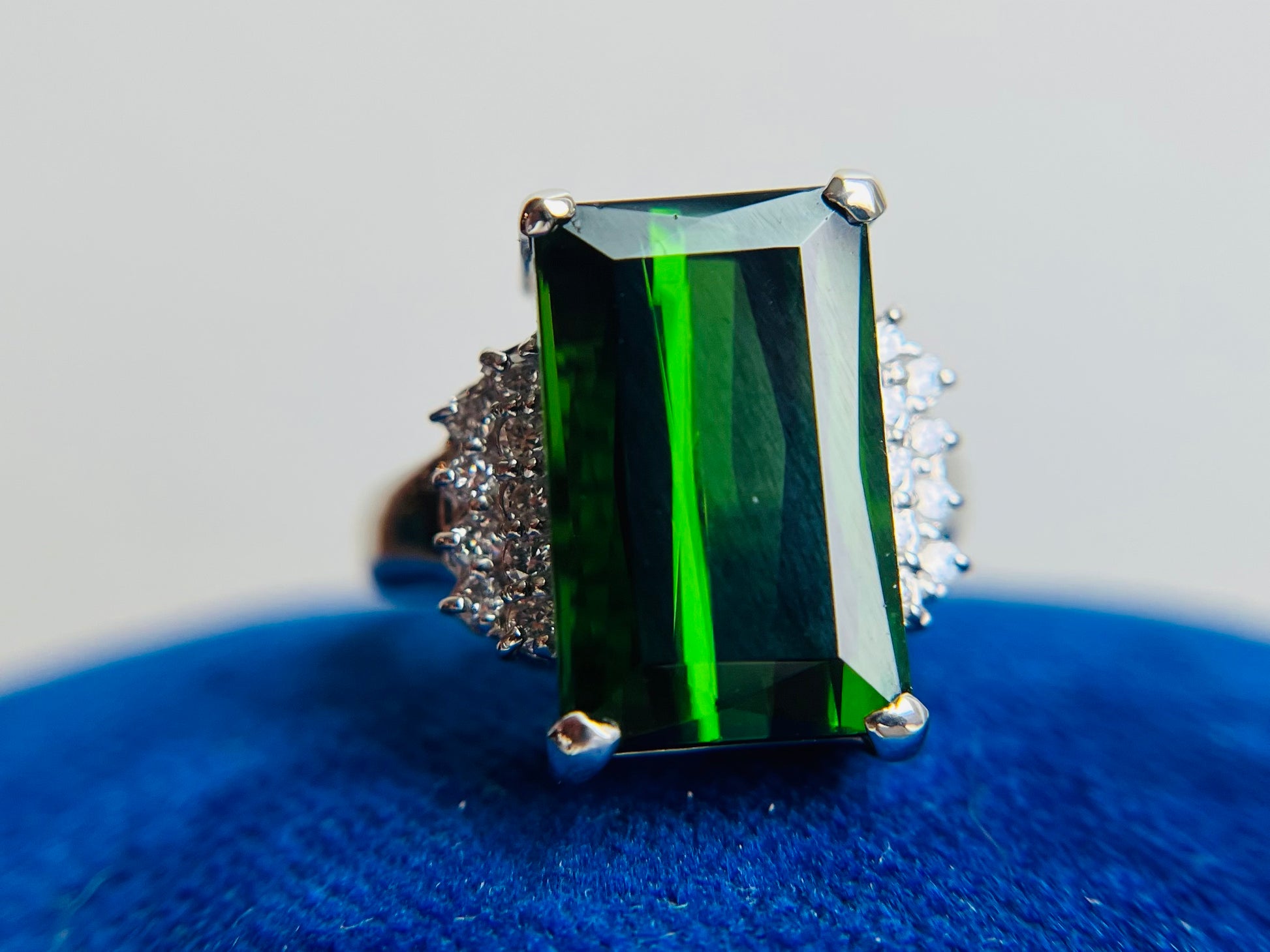 Introducing our exquisite PT900 Diamond and Green Tourmaline Ring—a true testament to luxury and sophistication. Crafted in premium platinum (PT900), this captivating ring boasts a total diamond weight of 0.22 carats, perfectly complementing the stunning 8.73-carat green tourmaline centerpiece.