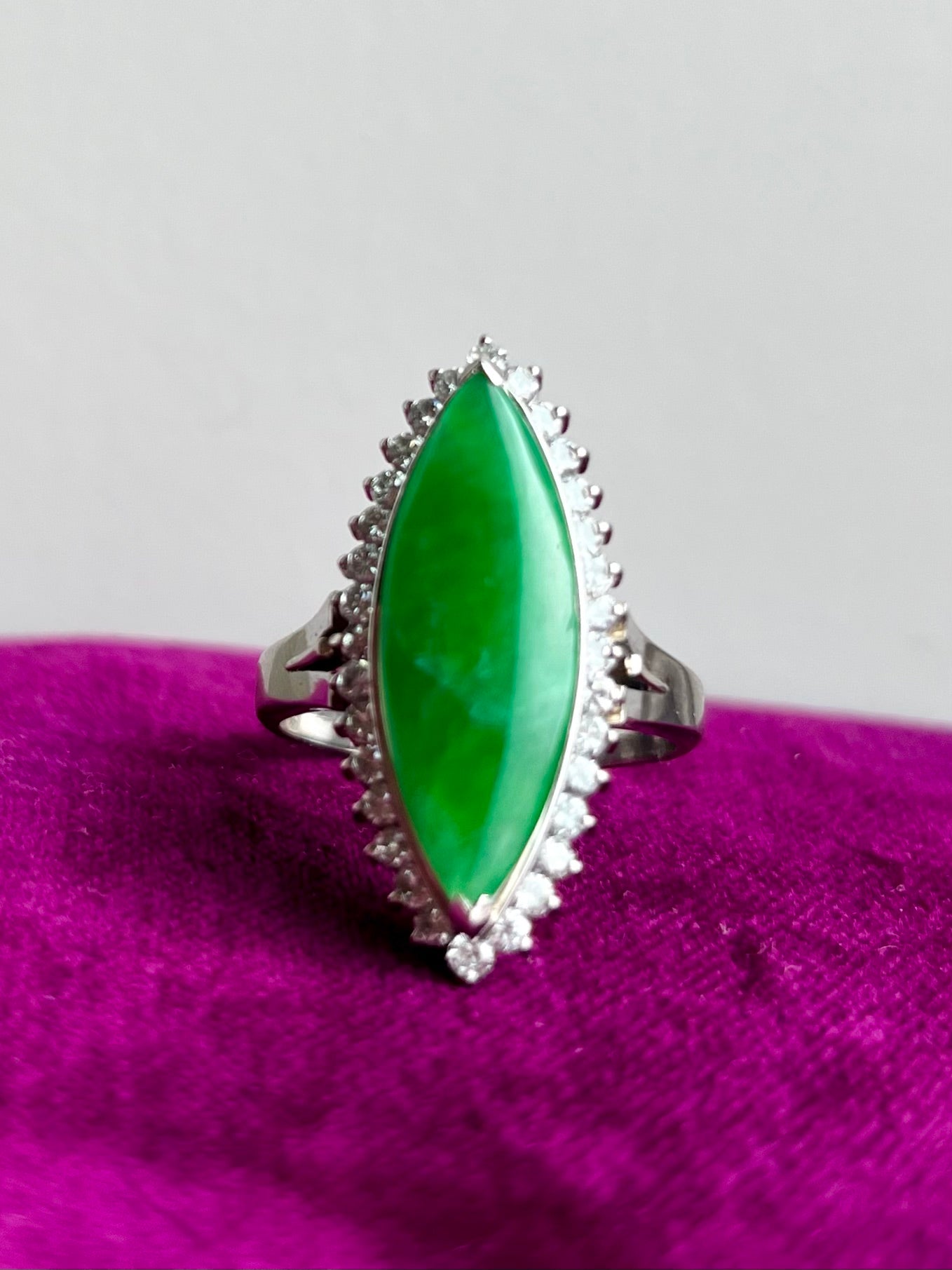 At the heart of the ring lies a large mesmerizing marquise-cut jade gemstone, exuding an enchanting green hue that symbolizes tranquility and harmony. The unique shape of the jade, combined with its rich color, creates a striking focal point that is sure to captivate attention.
