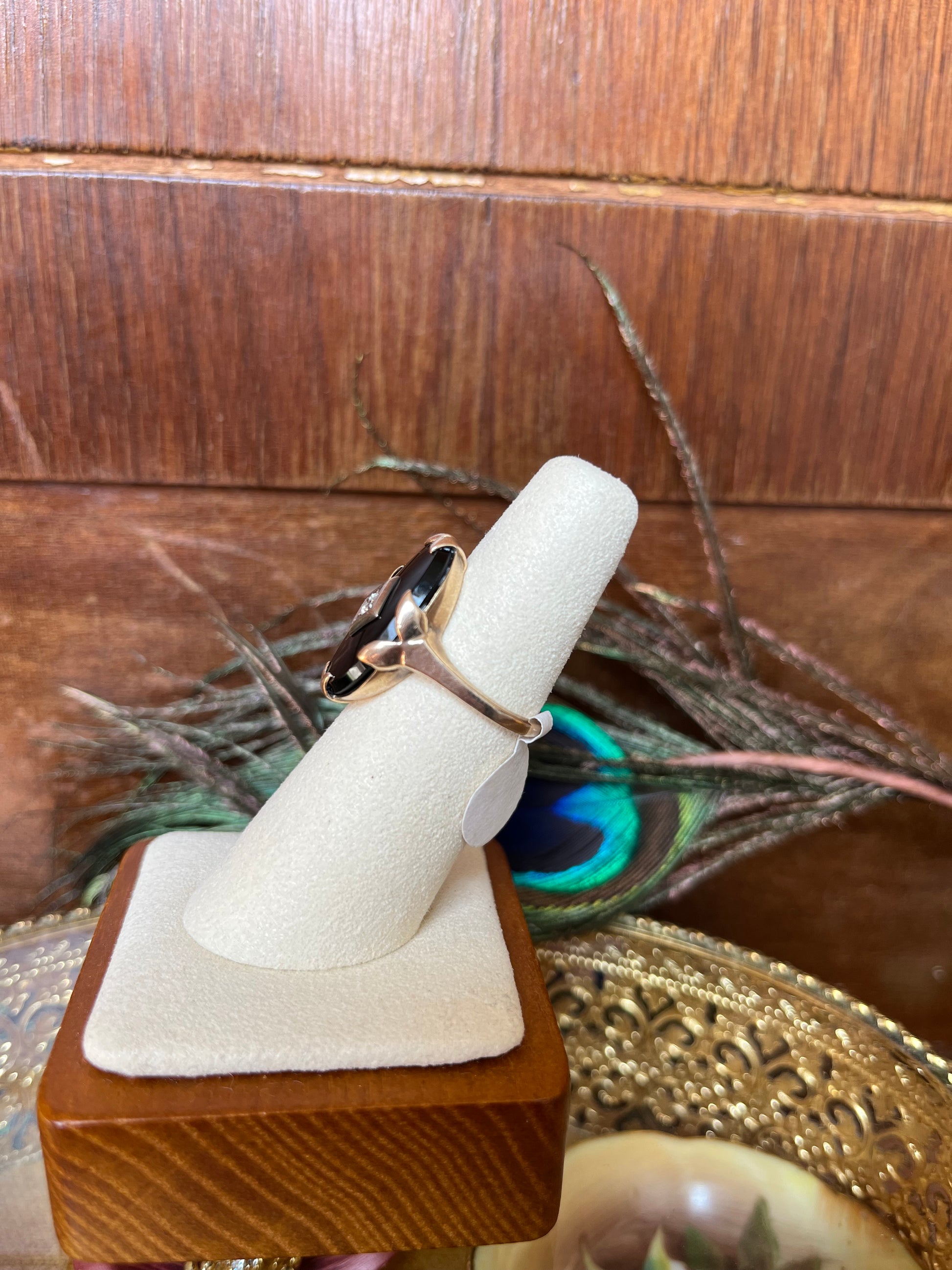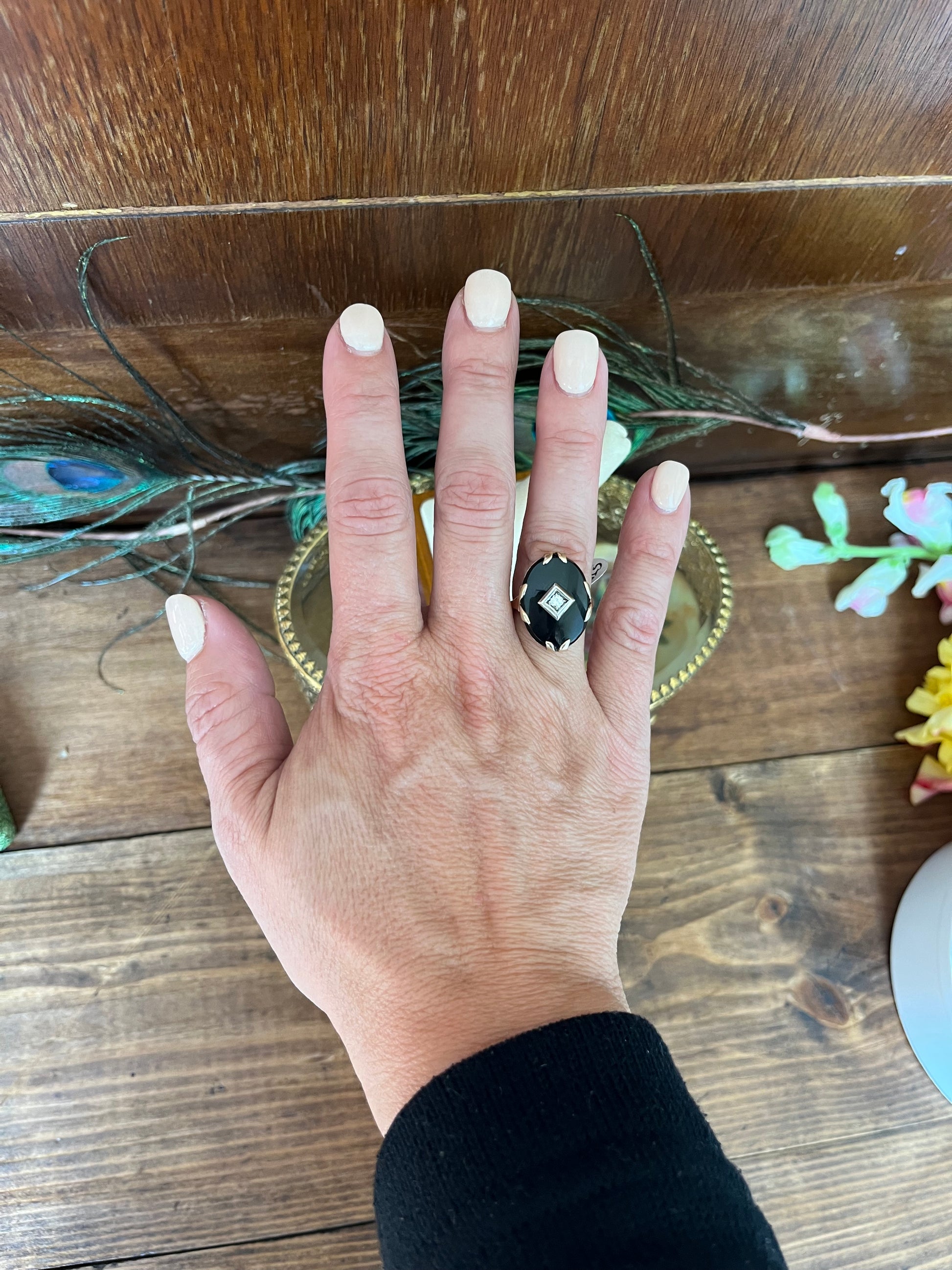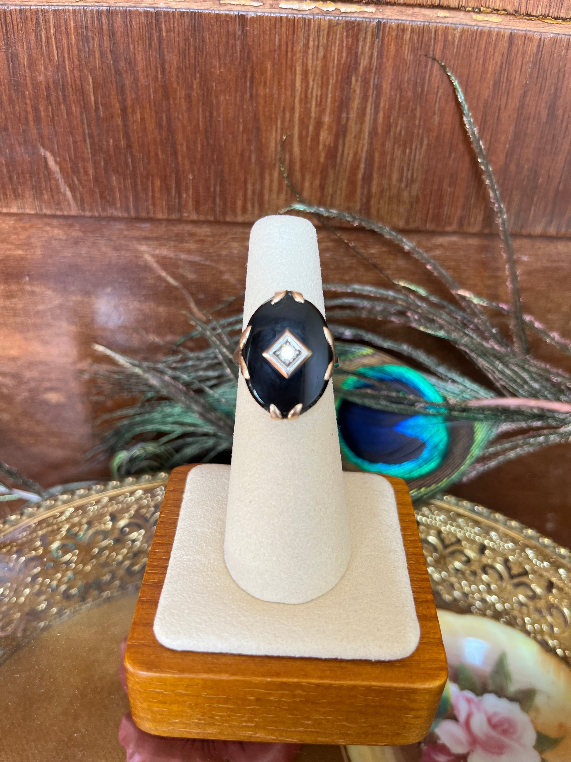 Be the envy of all your friends with this classic Vintage Onyx and Diamond Ring! This beauty features 14K yellow gold, a 3.6mm diamond center, and smooth onyx, with just a bit of patina beneath the bezel. Plus, its super-impressive crown measures 21.6mm by 14.5mm - a size 6 sure to make a statement!