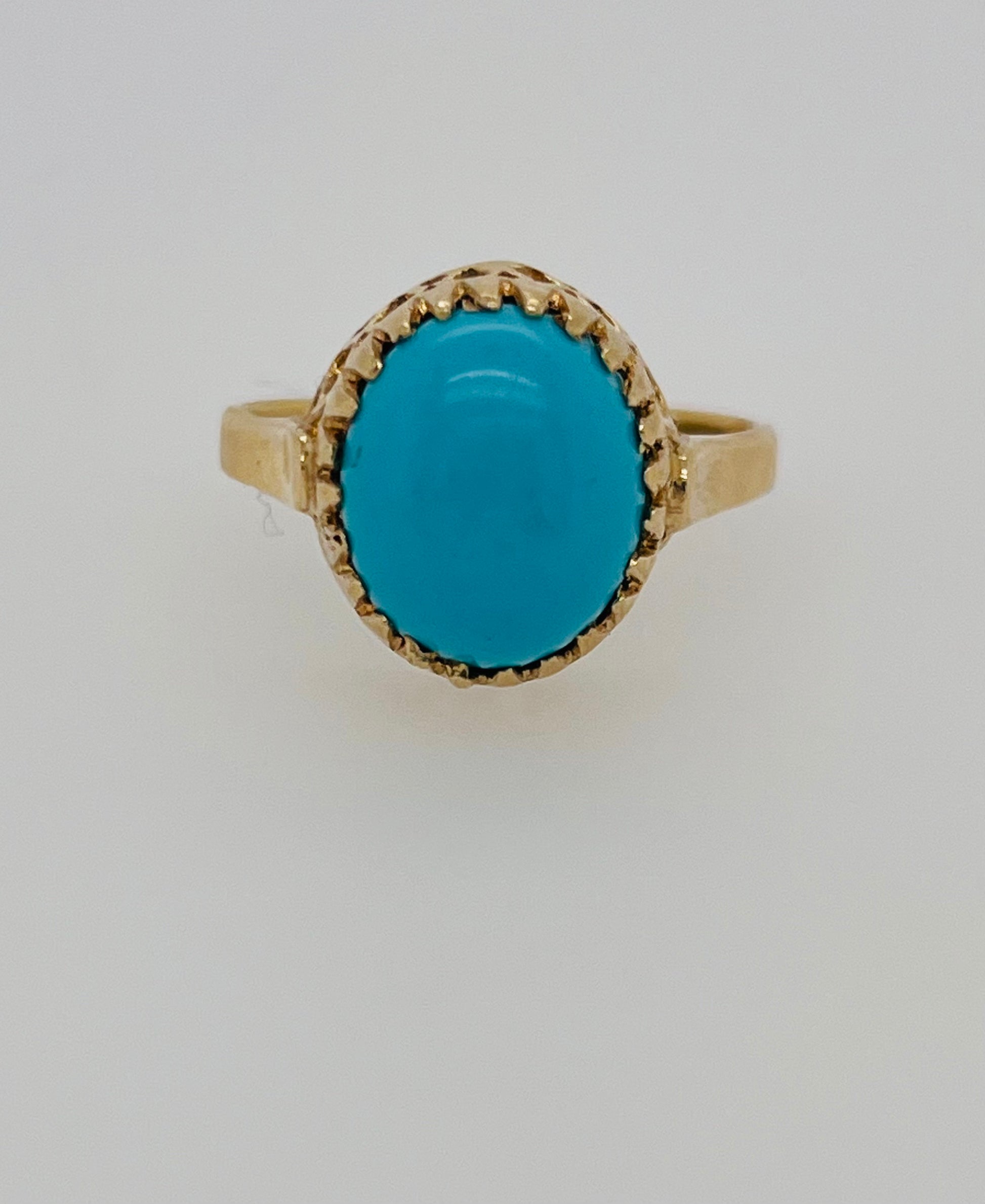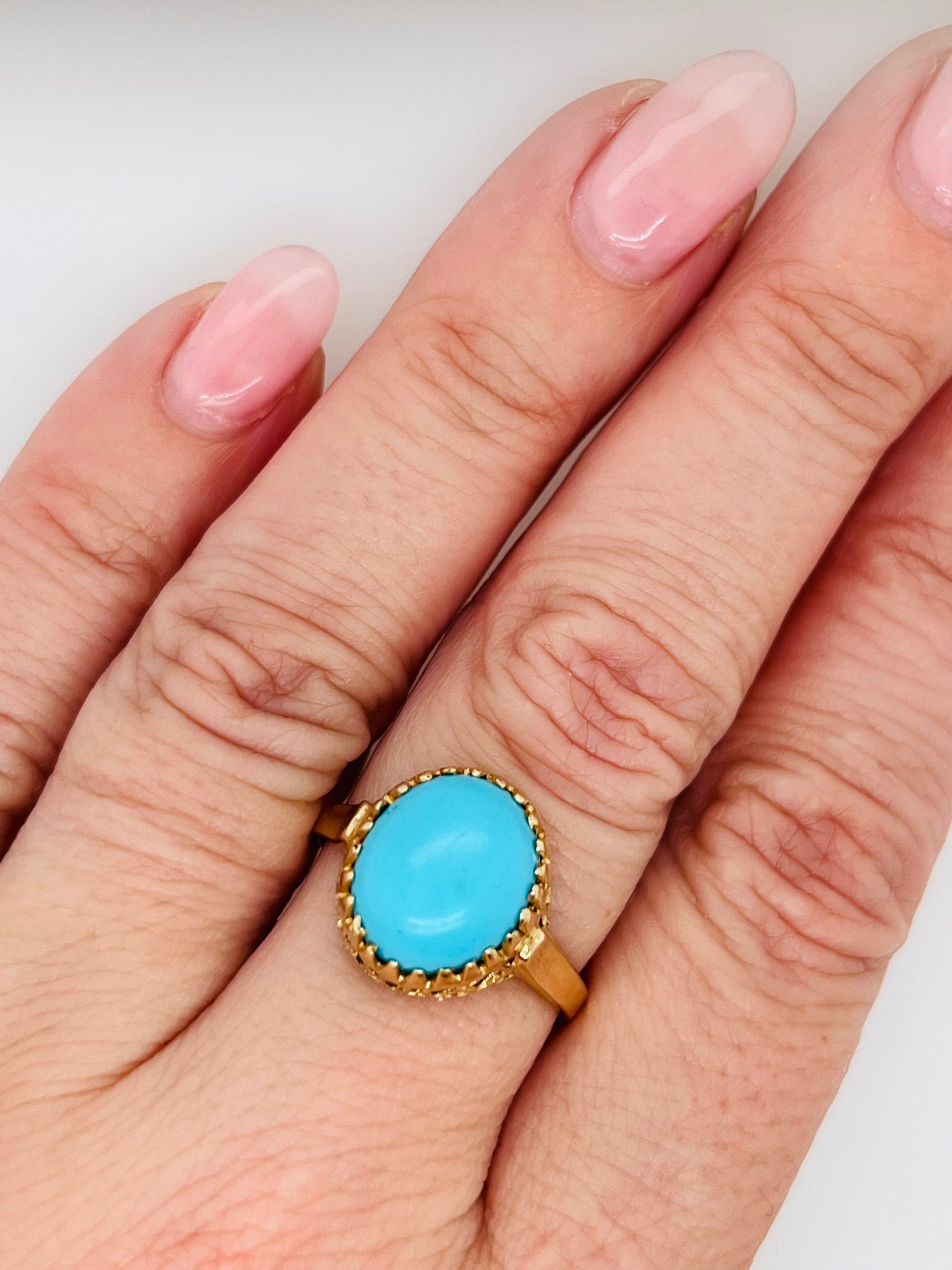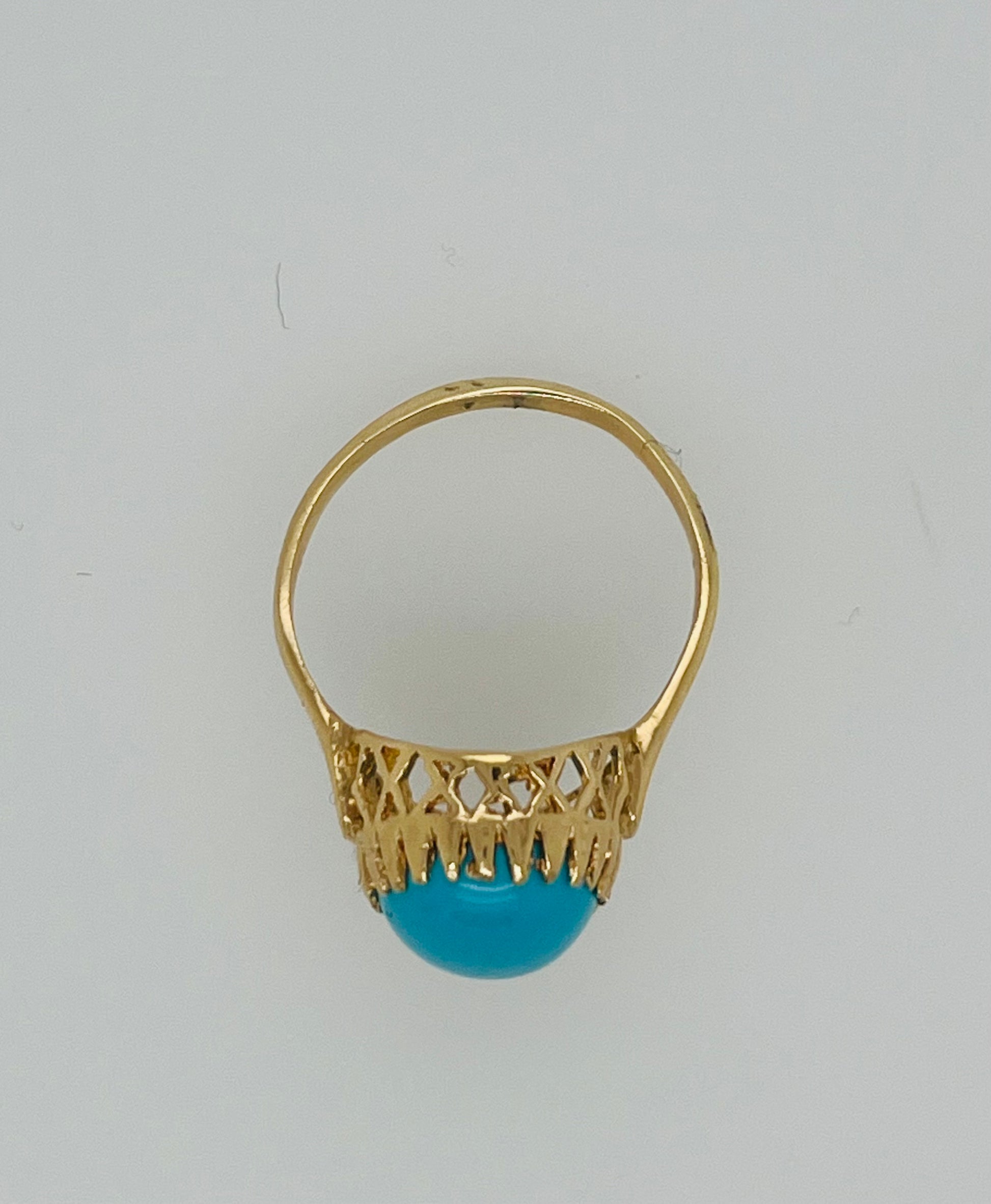 Bright aqua blue persian turquoise ring. Simple and elegant. No markings but acid tests at 14k. This ring is more than just a stylish accessory. Its stunning aqua blue Persian turquoise adds a pop of color to any outfit and will have you feeling like royalty. And with its 14k gold setting, it doesn't just sparkle, it shines.